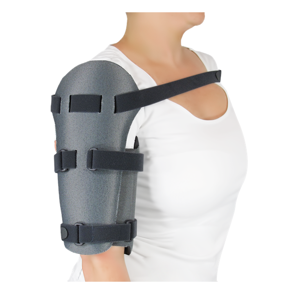 - Οι τρεις ιμάντες συμπίεσης του νάρθηκα, αυτοκόλλητοι και ρυθμιζόμενοι σε θέσεις επιλογής, επιτρέπουν την κίνηση της άρθρωσης του αγκώνος.