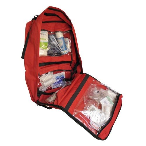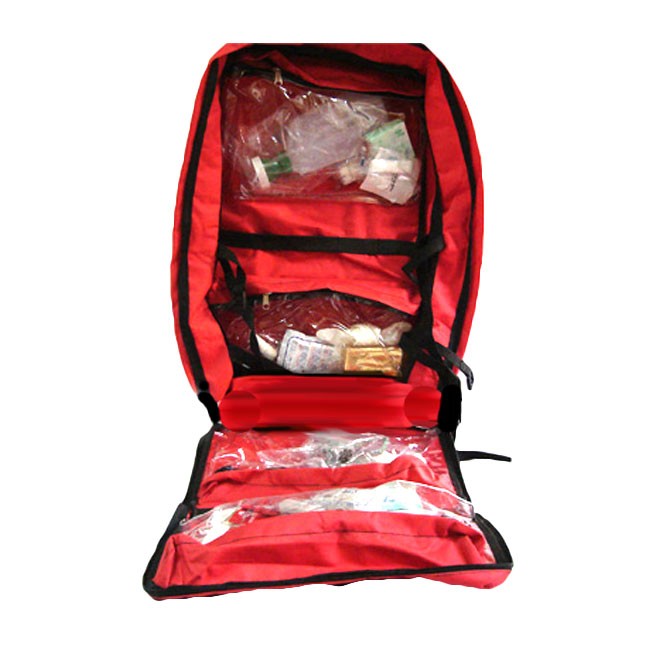 Back Pack-1 A’ βοηθειών Ισοθερμική τσάντα πλάτης. Έχει τέσσερεις διάφανες θήκες με φερμουάρ για να συγκρατούνται τα περιεχόμενα, εγκάρσιο ιμάντα πρόσδεσης και στήριξης φιάλης οξυγόνου μέχρι και 2 lt. Ραμμένος υπάρχει εγκάρσια ελαστικός ιμάντας όπου δημιουργούνται οπές διαφόρων μεγεθών για τη συγκράτηση και ταξινόμηση Ιατρικών Βοηθημάτων. Επίσης διαθέτει εξωτερική θήκη με φερμουάρ πάνω από την οποία υπάρχει διάφανη θήκη για τη λίστα περιεχομένων του φαρμακείου. Τέλος, έχει εξωτερικούς ιμάντες για τη μέση και σύστημα στήριξης της τσάντας στην πλάτη όπως επίσης και μια χειρολαβή στη κορυφή της τσάντας για την κάθετη μεταφορά αυτής.