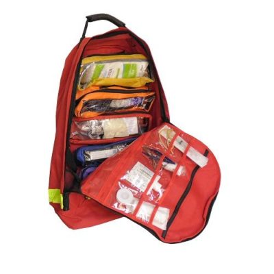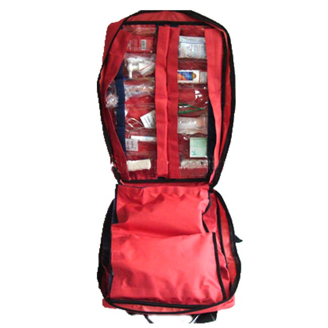 Back Pack-3 48x33x11cm – Εμφανείς ανακλαστικές ταινίες – Χειρολαβές μεταφοράς και 2 ιμάντες ώμων που επιτρέπουν στο να φορεθεί στην πλάτη. – Εμπεριεχόμενα σακκίδια: σκούρο γαλάζιο, ανοιχτό γαλάζιο, θαλασσί, μαύρο, κόκκινο και πράσινο. Υφασμάτινη τσάντα με ραμμένο εγκάρσιο ελαστικό ιμάντα όπου δημιουργούνται οπές διαφόρων μεγεθών για τη συγκράτηση και ταξινόμηση ιατρικών βοηθημάτων. Έχει επίσης υφασμάτινες θήκες πορτοκαλί χρώματος ραμμένες στο εσωτερικό της τσάντας για ιατρικά βοηθήματα. Εξωτερικά έχει διάφανη θήκη για τα περιεχόμενα του φαρμακείου, φερμουάρ για να κλείνει, 2 χειρολαβές για την μεταφορά του και ιμάντα στήριξης της τσάντας στον ώμο.