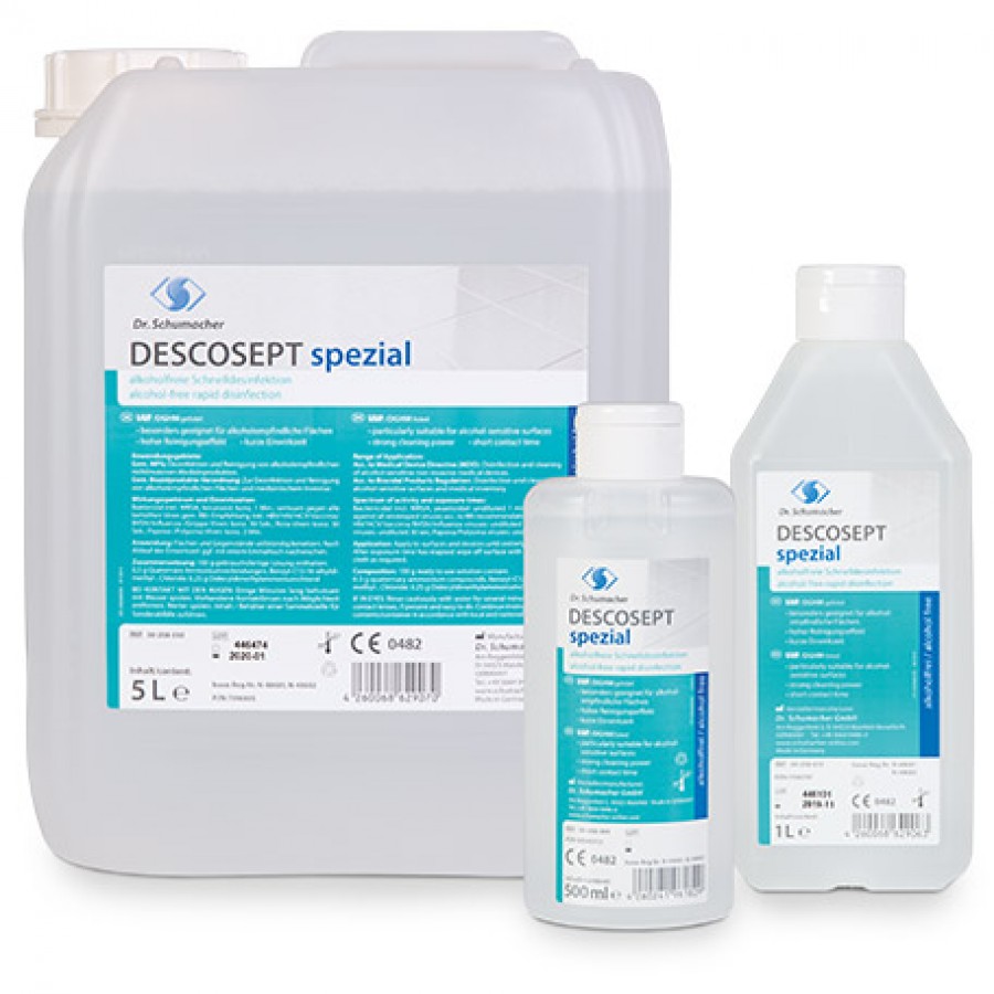 Το Descosept spezial είναι ένα έτοιμο προς χρήση διάλυμα, χωρίς αλκοόλες, κατάλληλο για τον καθαρισμό και την απολύμανση ευαίσθητου ιατρικού εξοπλισμού και επιφανειών, όπως οθόνες, θερμοκοιτίδες, μόνιτορ κτλ.